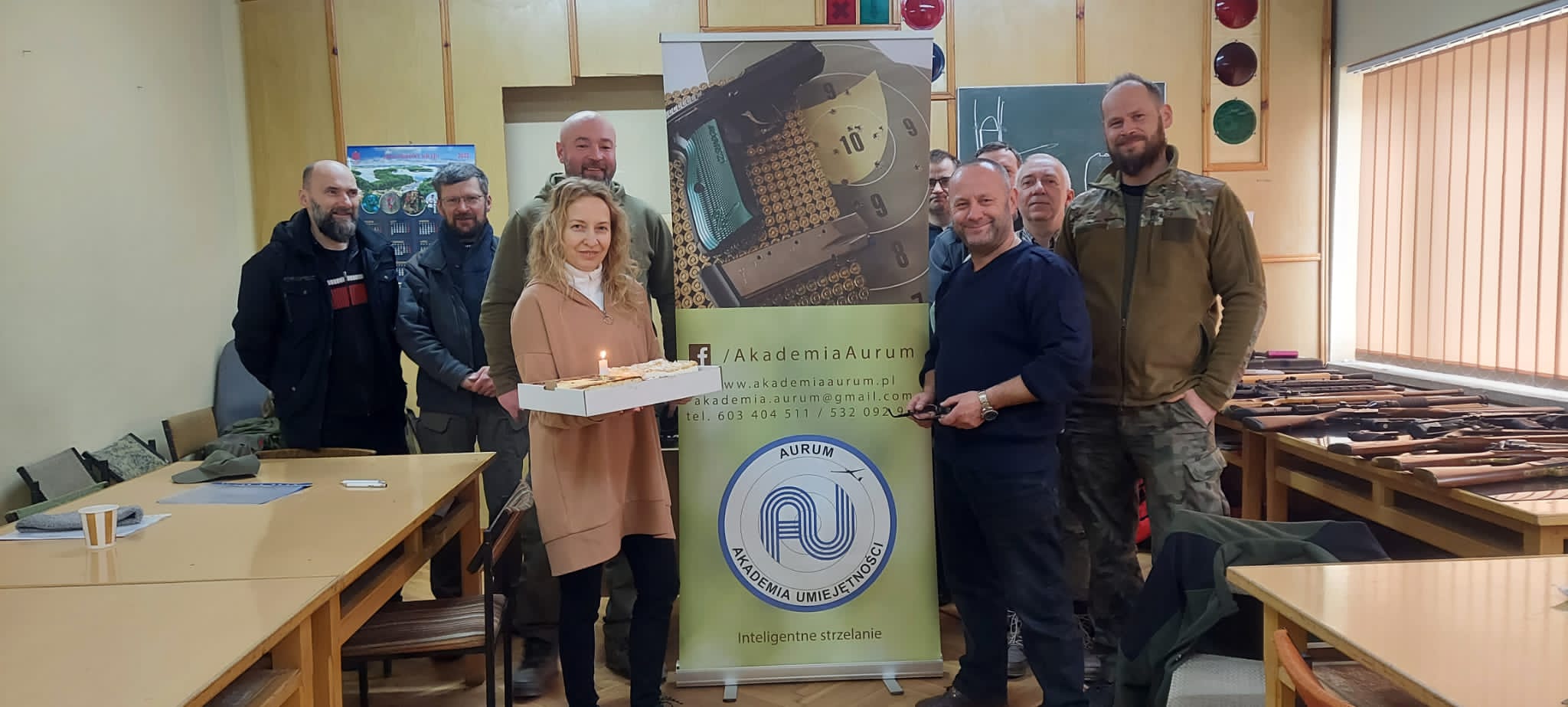 Akademia Umiejętności AURUM 22 marca 2023 roku obchodziła okrągły rok swojej działalności. Postanowiliśmy to uczcić w doborowym gronie uczestników naszego Kursu na Prowadzącego Strzelanie. I tak pośród całego mnóstwa zajęć, m.in. z zadań i obowiązków Prowadzącego Strzelanie, zasad bezpieczeństwa, zagadnień prawnych, budowy i zasad działania broni, pierwszej pomocy medycznej znalazło się miejsce na urodzinowe ciasto. Możliwość wspólnego świętowania Instruktorów AURUM i Kursantów dowodzi, że rozwijamy się, a nasze szkolenia cieszą się zainteresowaniem. Jesteśmy przekonani, że w kolejnych latach Akademia Umiejętności AURUM będzie nadal rozwijała swoje skrzydła.